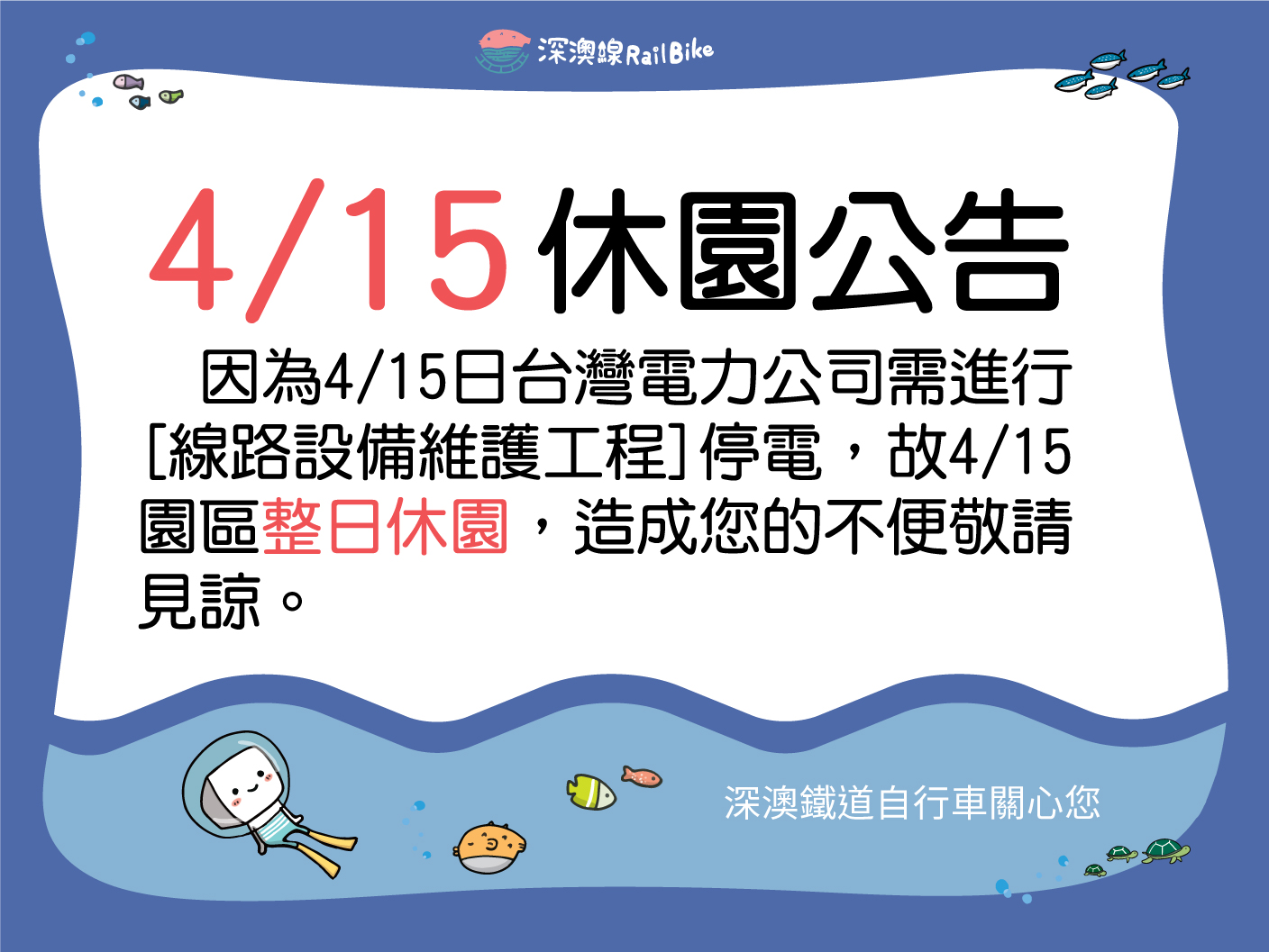 ‼️4/15日休園公告 因台灣電力公司【線路設備維護工程】停電 4/15日園區整日休園~~~ 造成您的不便敬請見諒